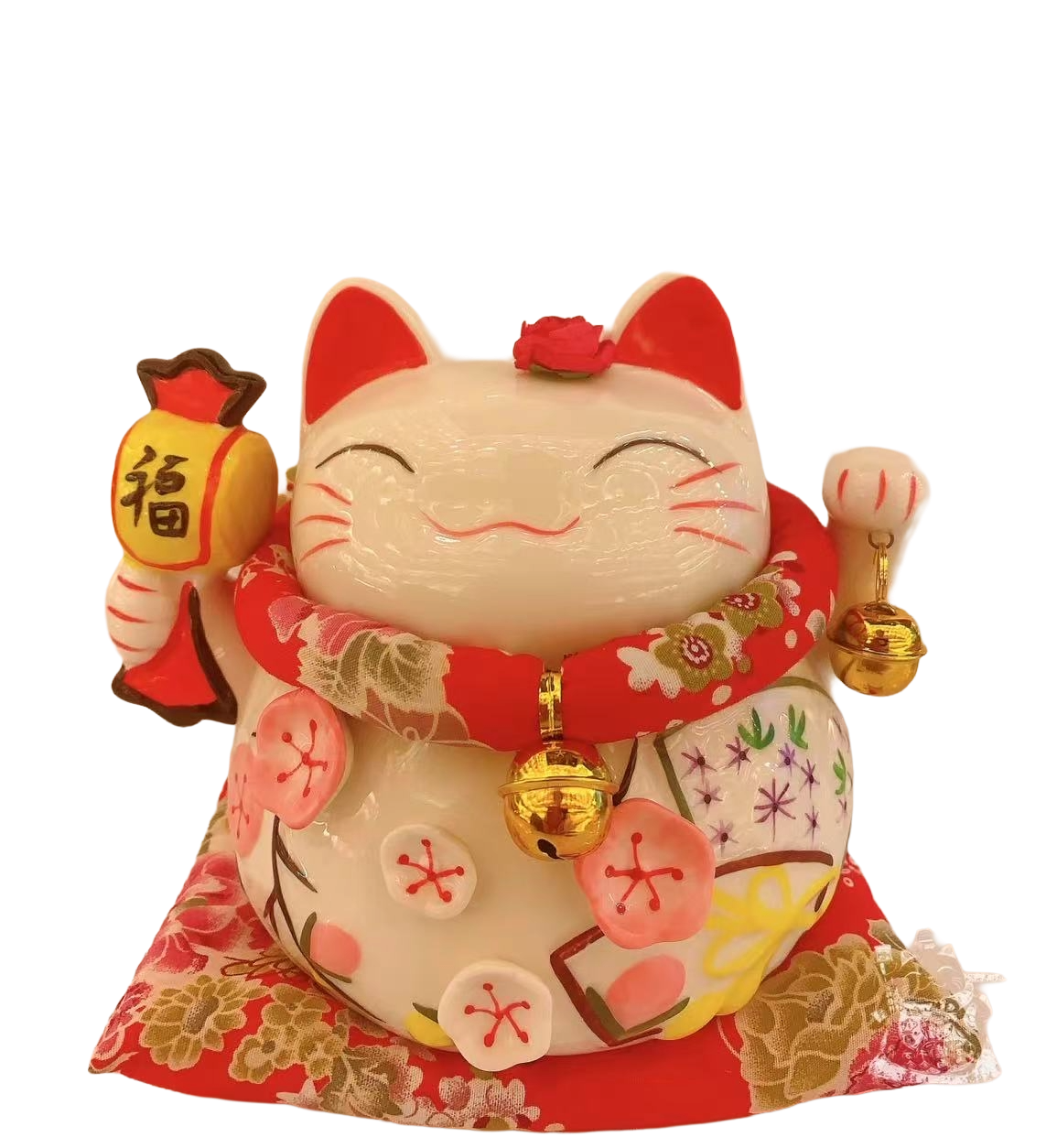 Description: 6″ PORCELAIN CAT BANK W/ FLORAL DESIGN 2 BELLS