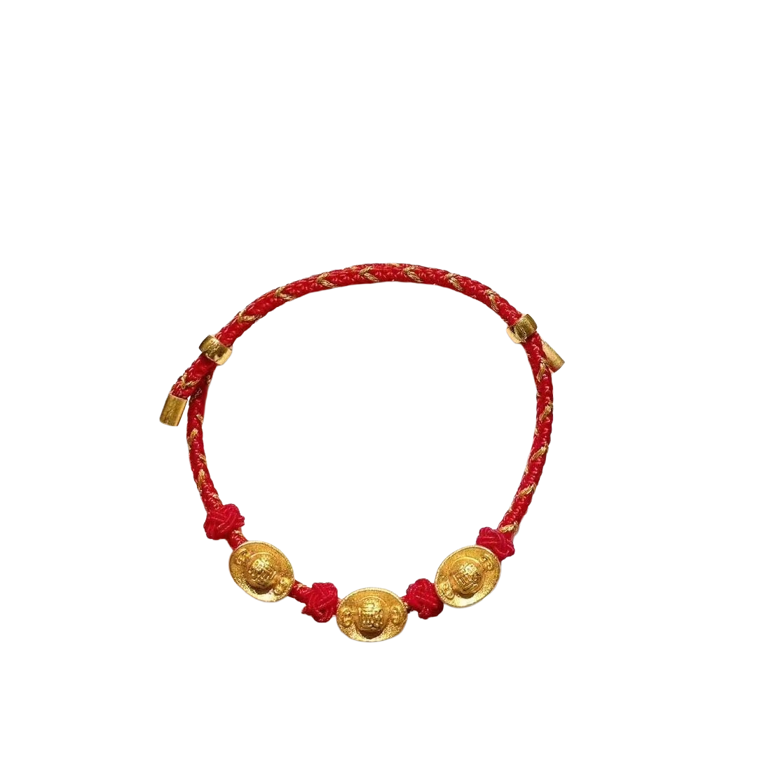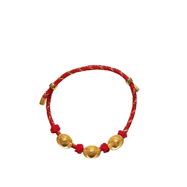 Description: ADJUSTABLE RED STRING BRACELET W/ 3 YUAN BAOS
