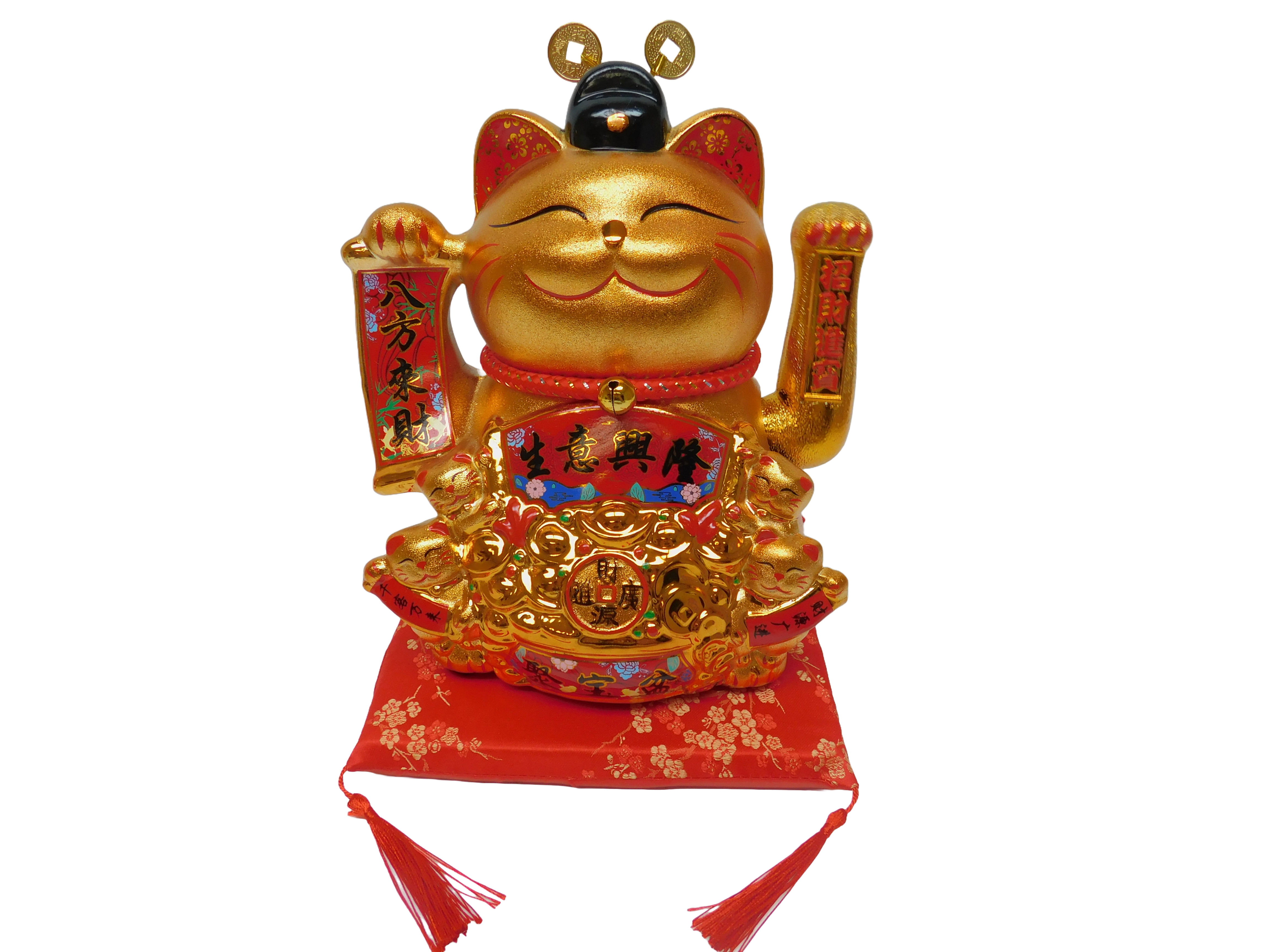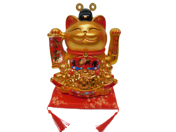 Description: 11″ x 10″ x 9″ GOLD LUCKY CAT W/ 4 CATS TREASURE