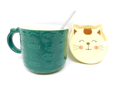 Description: CERAMIC CAT CUP W/LID GREEN CUP/YELLOW LID