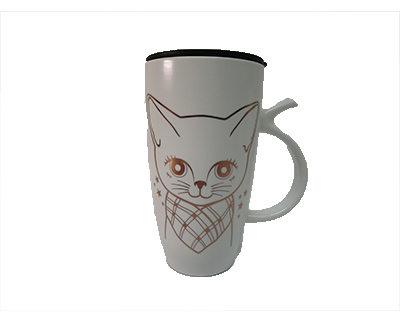 WHITE CERAMIC CAT CUP W/PLASTIC LID