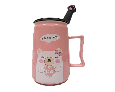 CERAMIC PINK BEAR CUP W/SPOON & LID