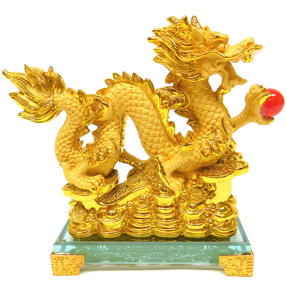 Description: 6″ X 2.5″ X5″ GOLD DRAGON ON RU YI & COINS CRYSTAL BASE