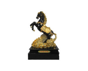 Description: 18.5″ BLACK HORSE ON WOODEN STAND W/ GOLD ACCENTS