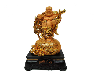 9″ X 6.25″ X 4.5″ GOLD BUDDHA CARRYING COINS & YUAN BAO ON TOP MONEY BAG