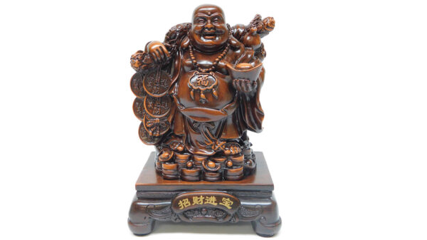 10″ X 6″ X 7″ WOOD COLOR BUDDHA HOLDING YUAN BAO ON YUAN BAOS & COINS