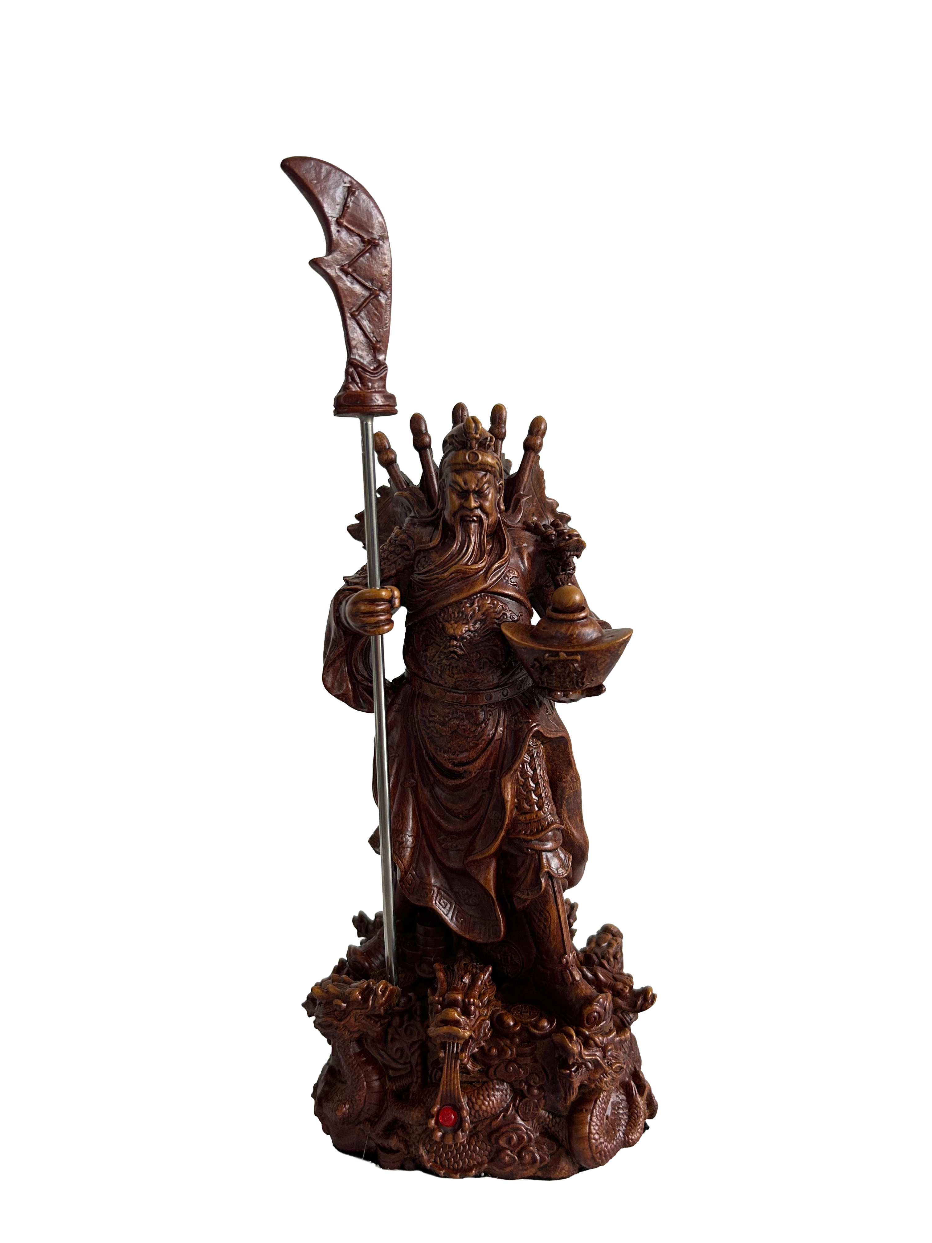 Description: 8″ x 4″ x 4″ WOODEN KWAN KONG HOLDING TREASURE POT
