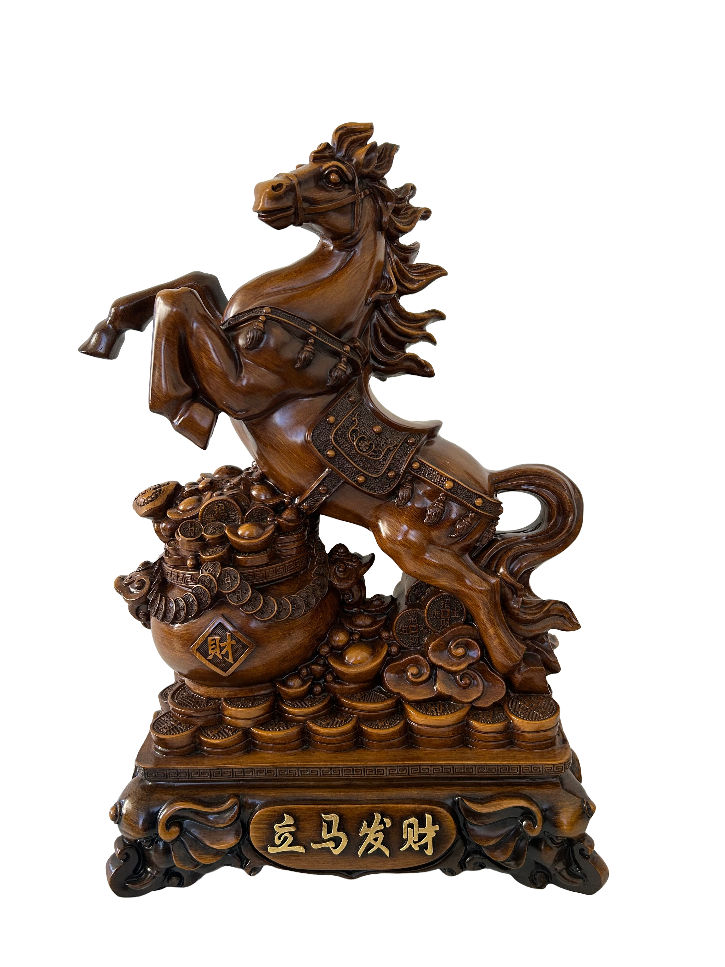 Description: 16.5″ x 11″ x 7″ WOODEN HORSE STATUE W/ TREASURE POT