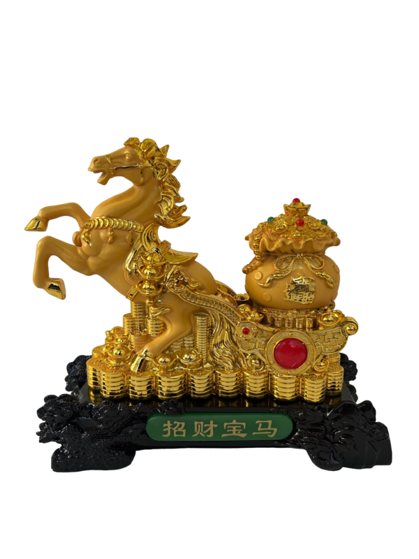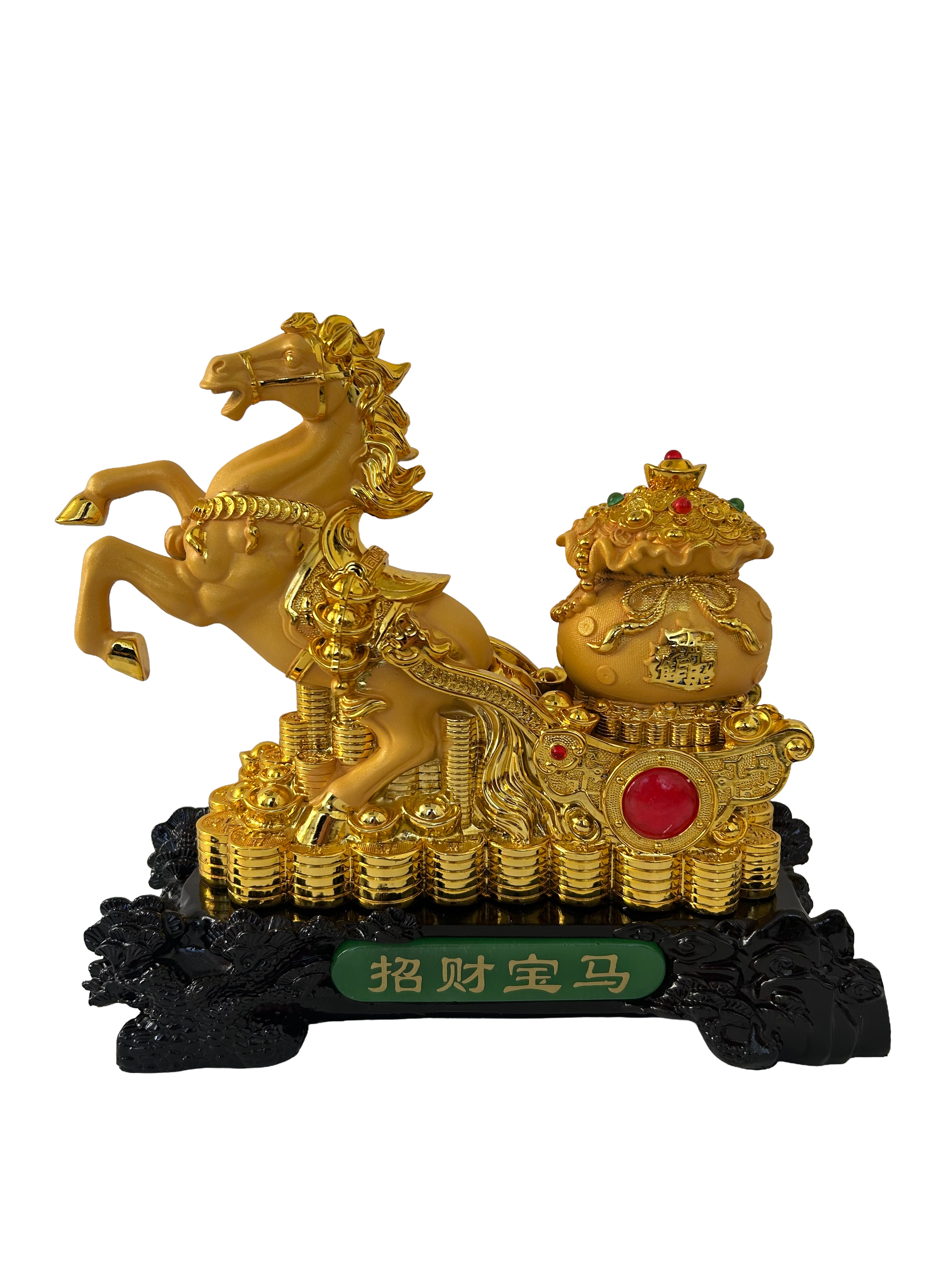 10″ x 10.5″ x 4.5″ GOLD HORSE W/ CARRIOT CARRYING MONEY BAG TREASURE ON WOODEN BASE