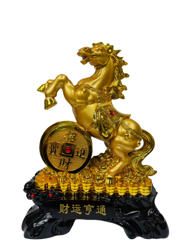 20″ X 11.75″ X 26″ STANDING GOLD HORSE W/ TREASURE POT ON WOODEN BASE