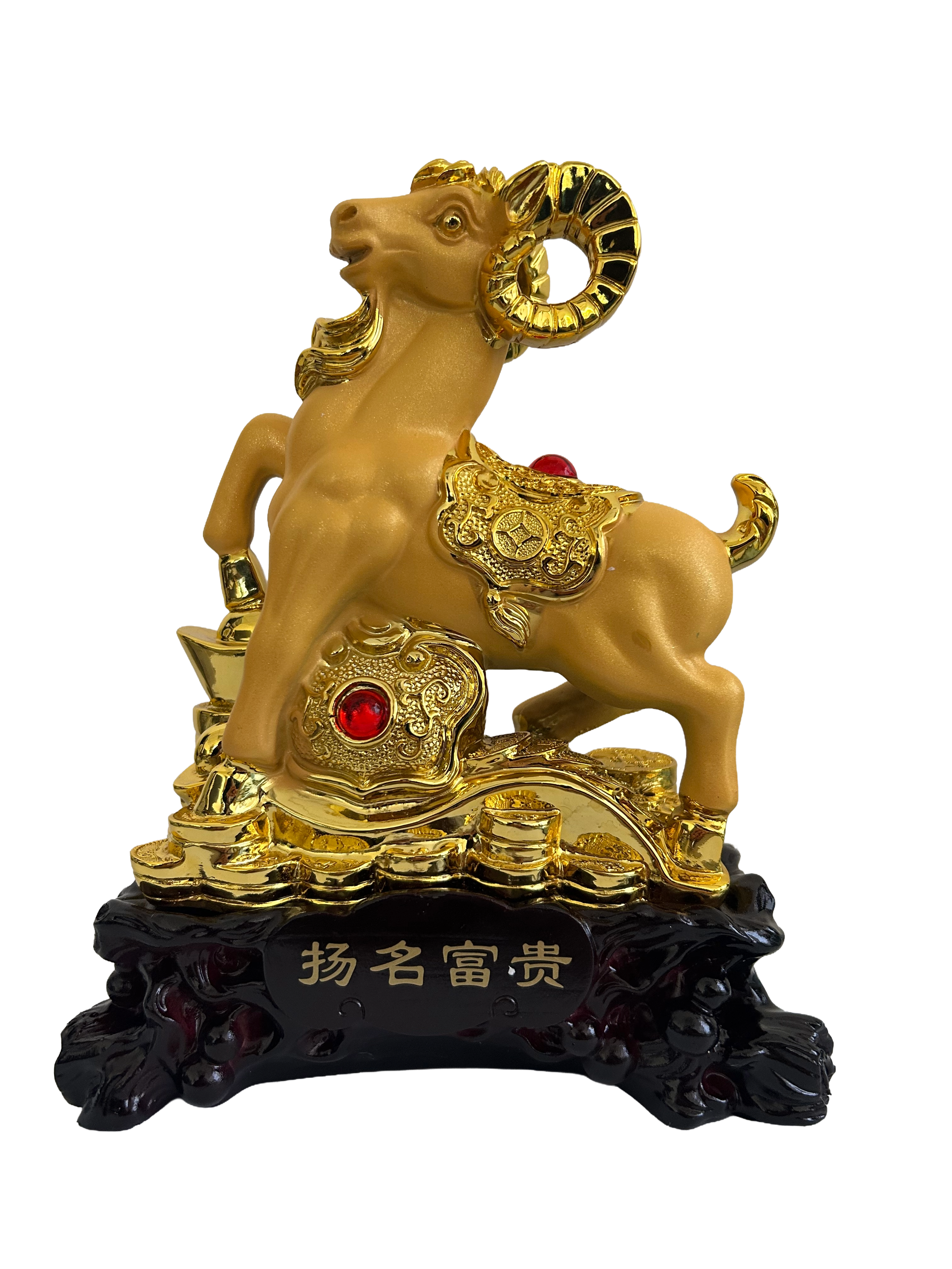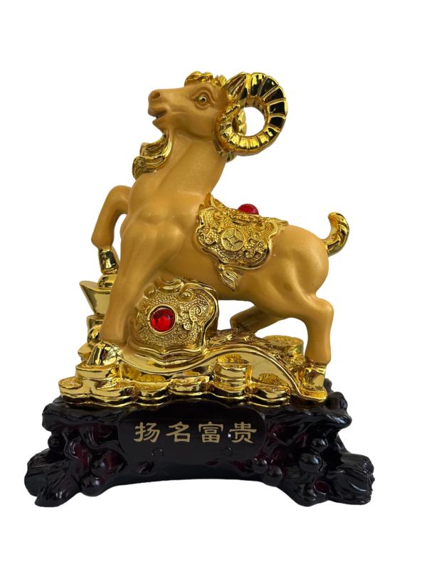 Description: 12″ x 9″ x 5″ GOLD RAM W/ TREASURE ON WOODEN BASE
