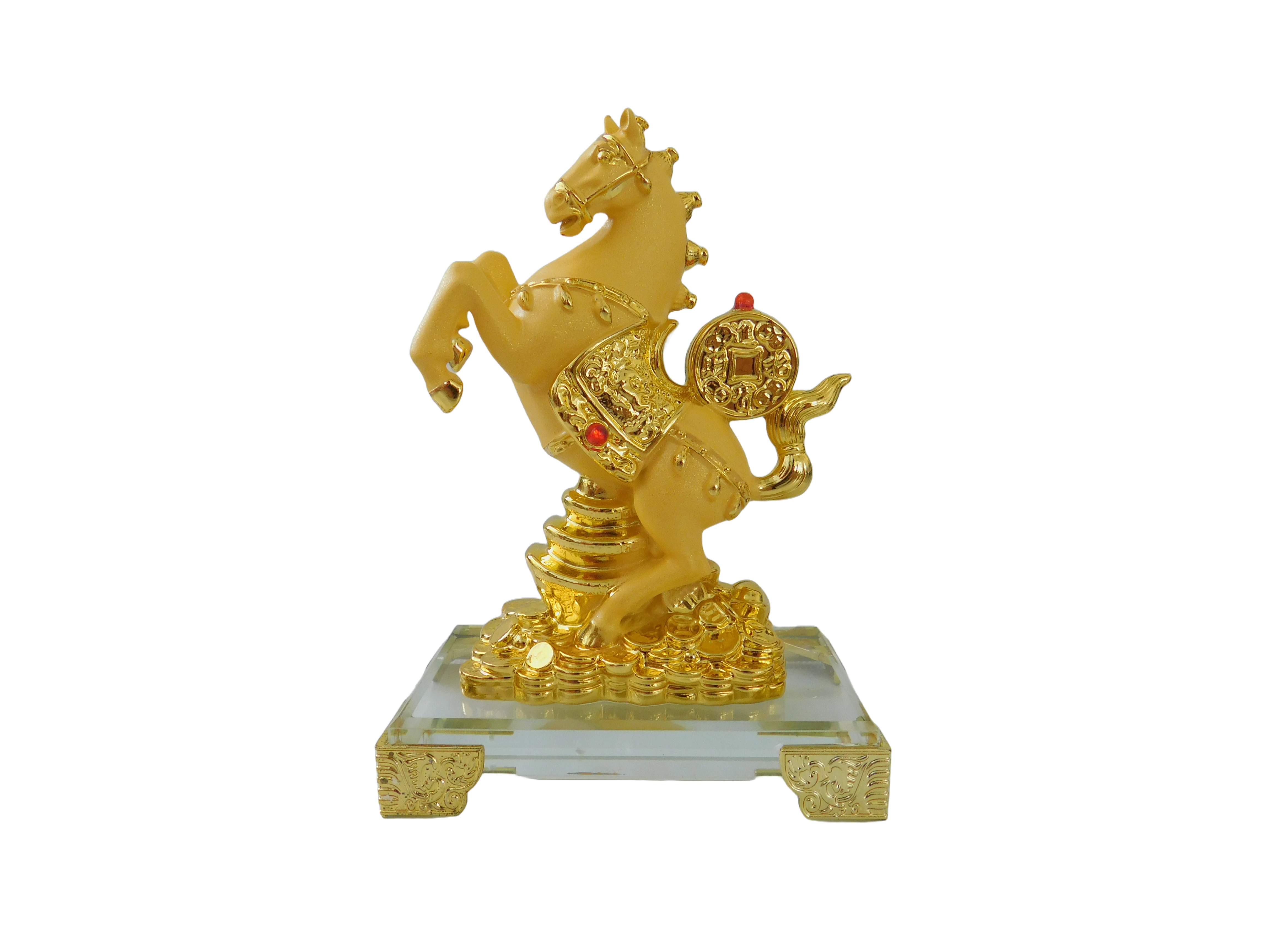 Description: 6″ x 4″ x 2.5″ GOLD HORSE ON CRYSTAL BASE W/ COIN ON BACK