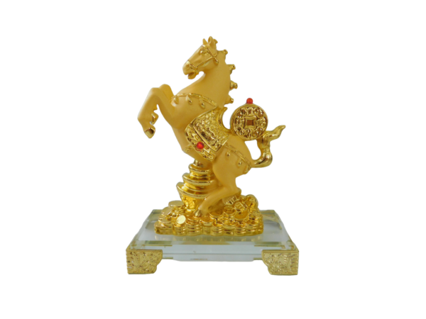 8″ X 5″ X 3″ GOLD HORSE W/ COIN ON YUAN BAO TREASURE W/ CRYSTAL BASE