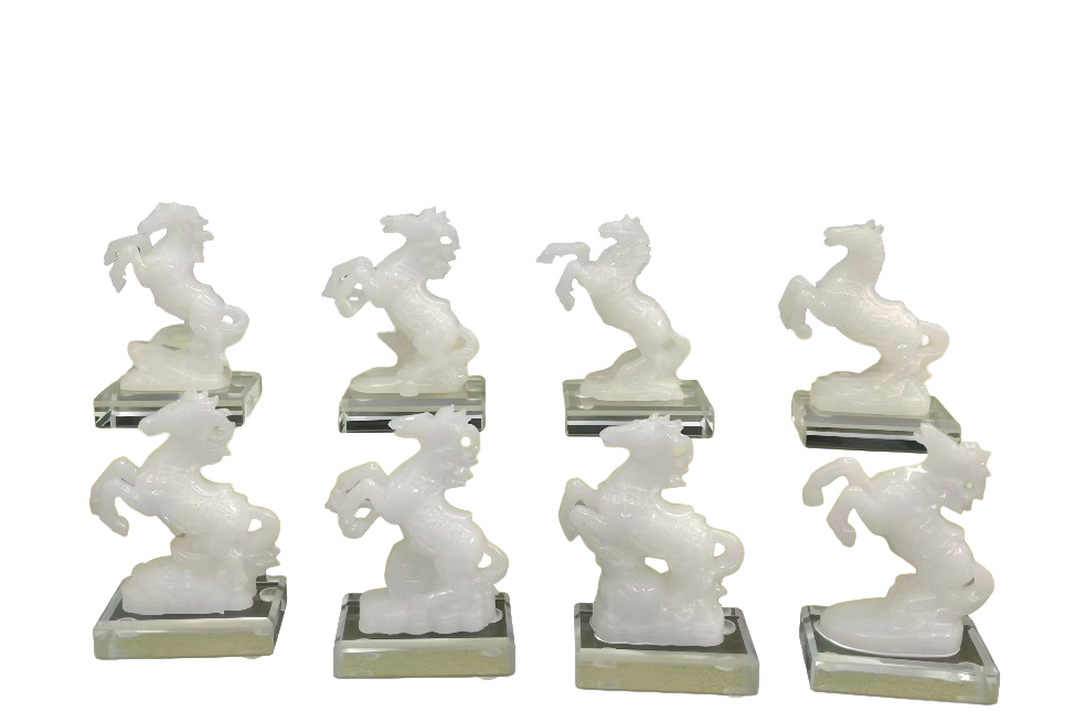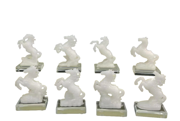 Description: 3.5″ 8PCS WHITE SET OF HORSES W/ CRYSTAL BASE STANDING
