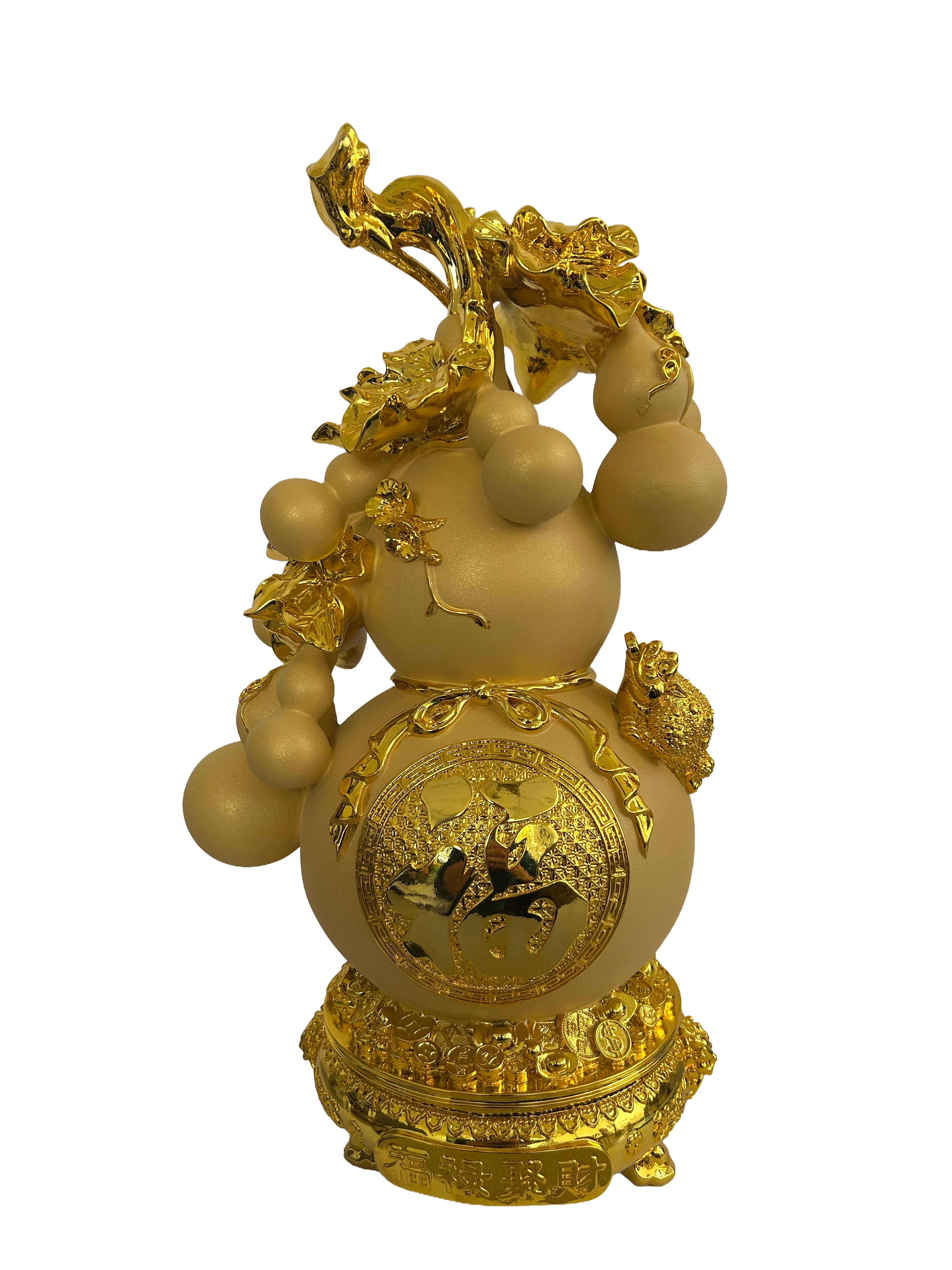 Description: 19″ x 11″ x 19″ GOLD COLORED HULU ON TREASURE POT BASE