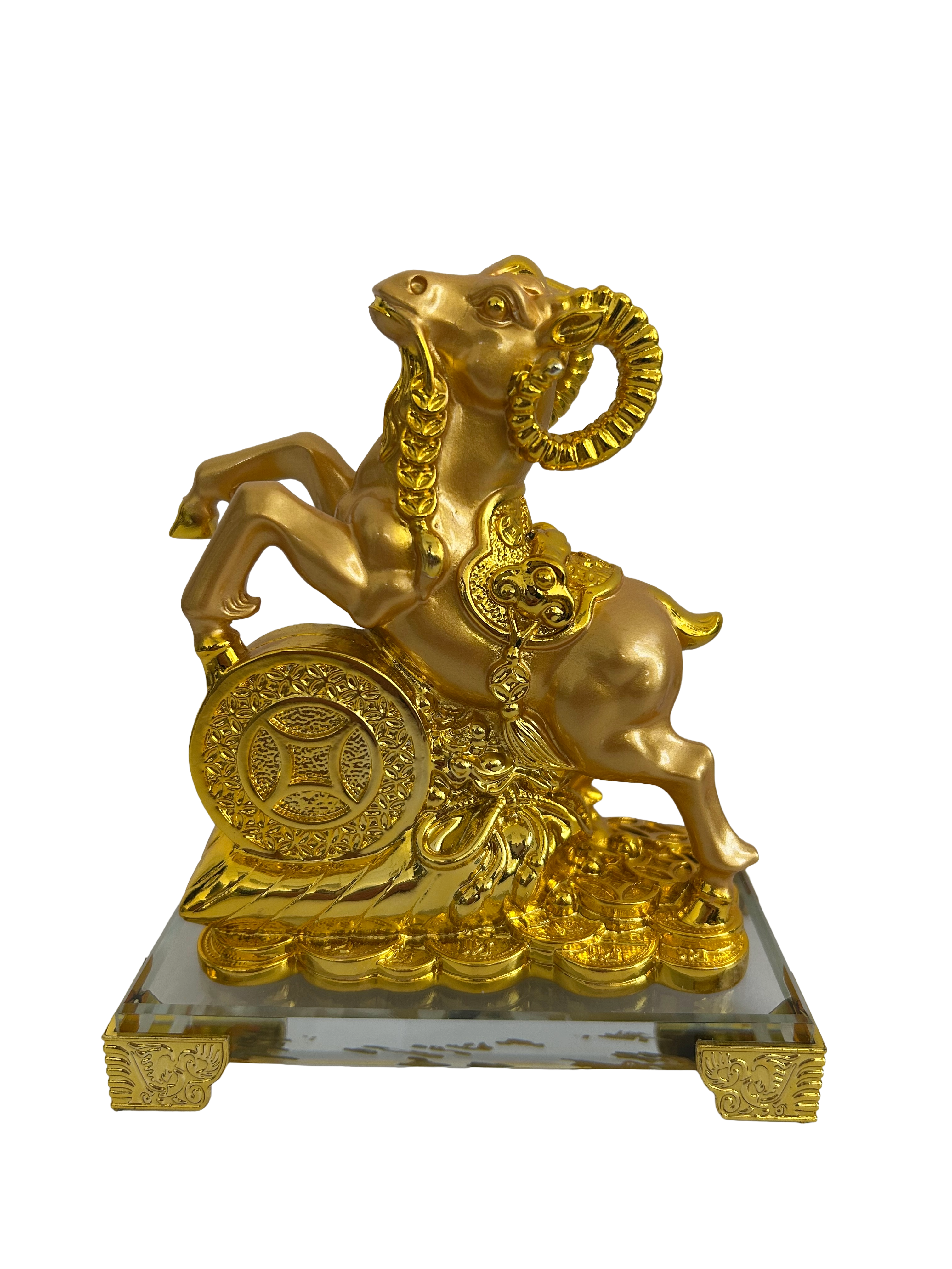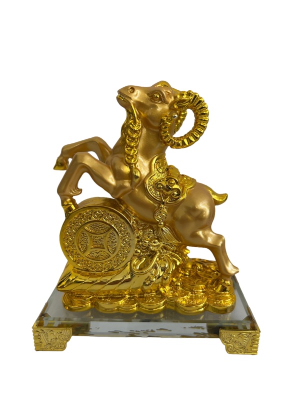 Description: 5.5″ x 4.5″ x 3″ GOLD RAM WITH COIN ON CRYSTAL BASE