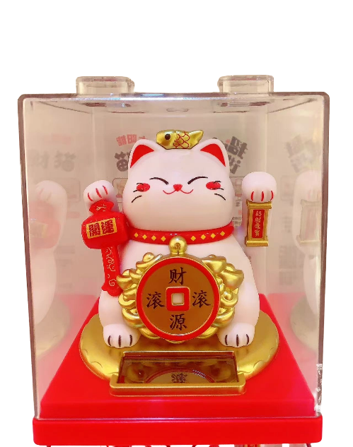 Description: 3.75″ X 3.25″ X 3.25″ SOLAR WHITE LUCKY CAT W/ YUAN BAO/COIN