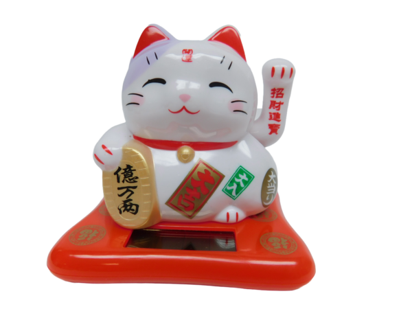 Description: 4″ x 4″ x 4″ SOLAR LUCKY CAT WHITE/ PURPLE SPOT