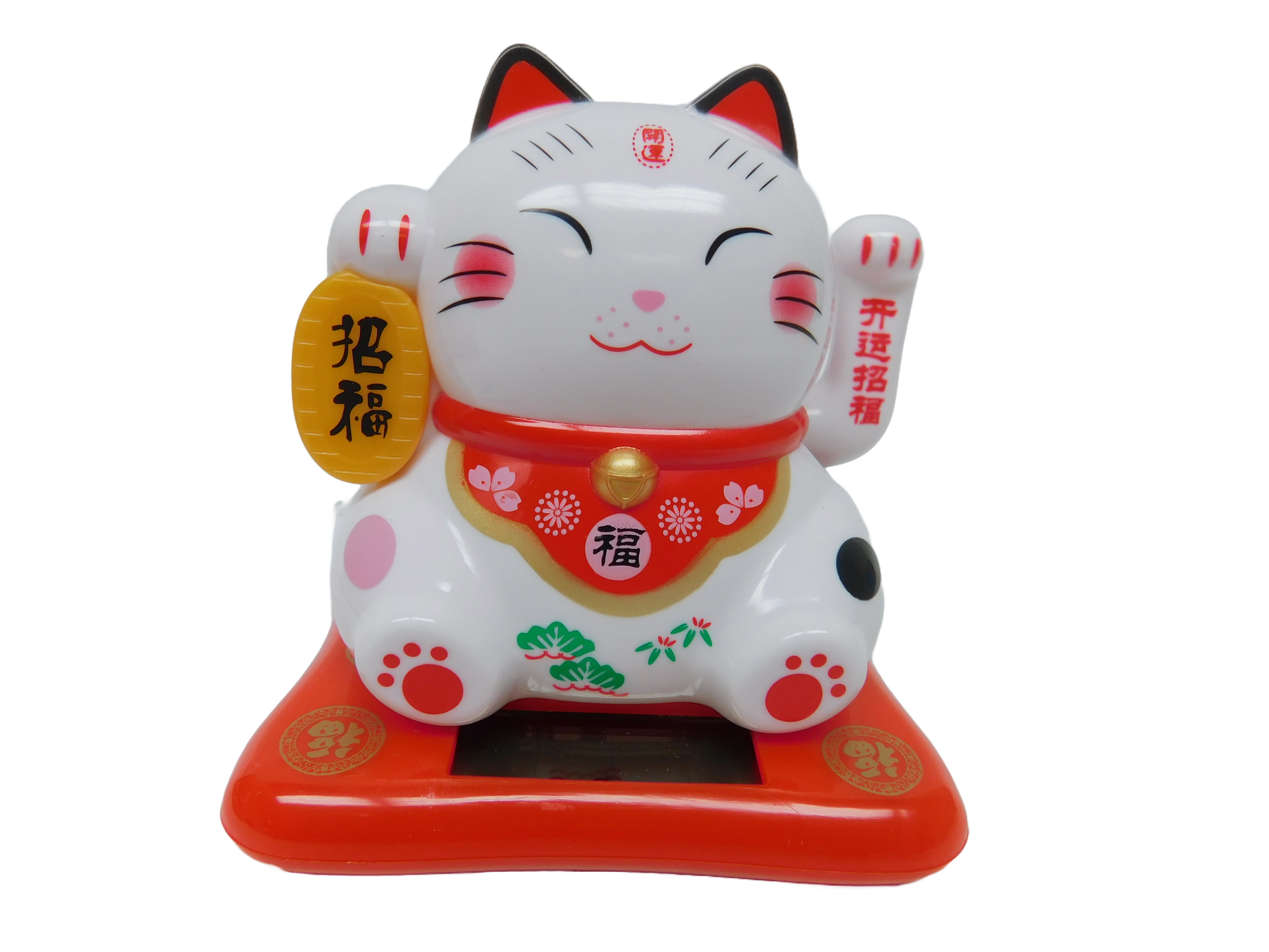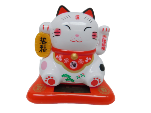 Description: 4″ x 4″ x 4″ SOLAR LUCKY CAT WHITE W/ RED BIB