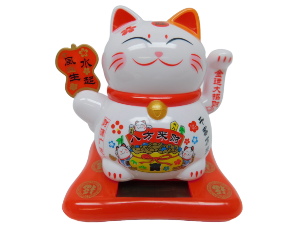 Description: 4″ x 4″ x 4″ SOLAR LUCKY CAT WHITE W/ ORANGE EARS