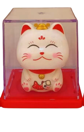 Description: 2.25″ X 3″ X 3″ WHITE LUKCY CAT W/ FISH DESIGN SOLAR