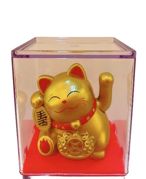 Description: 2.5″ x 2″ x 2.25″ GOLD LUCKY CAT W/ YUAN BAO SOLAR