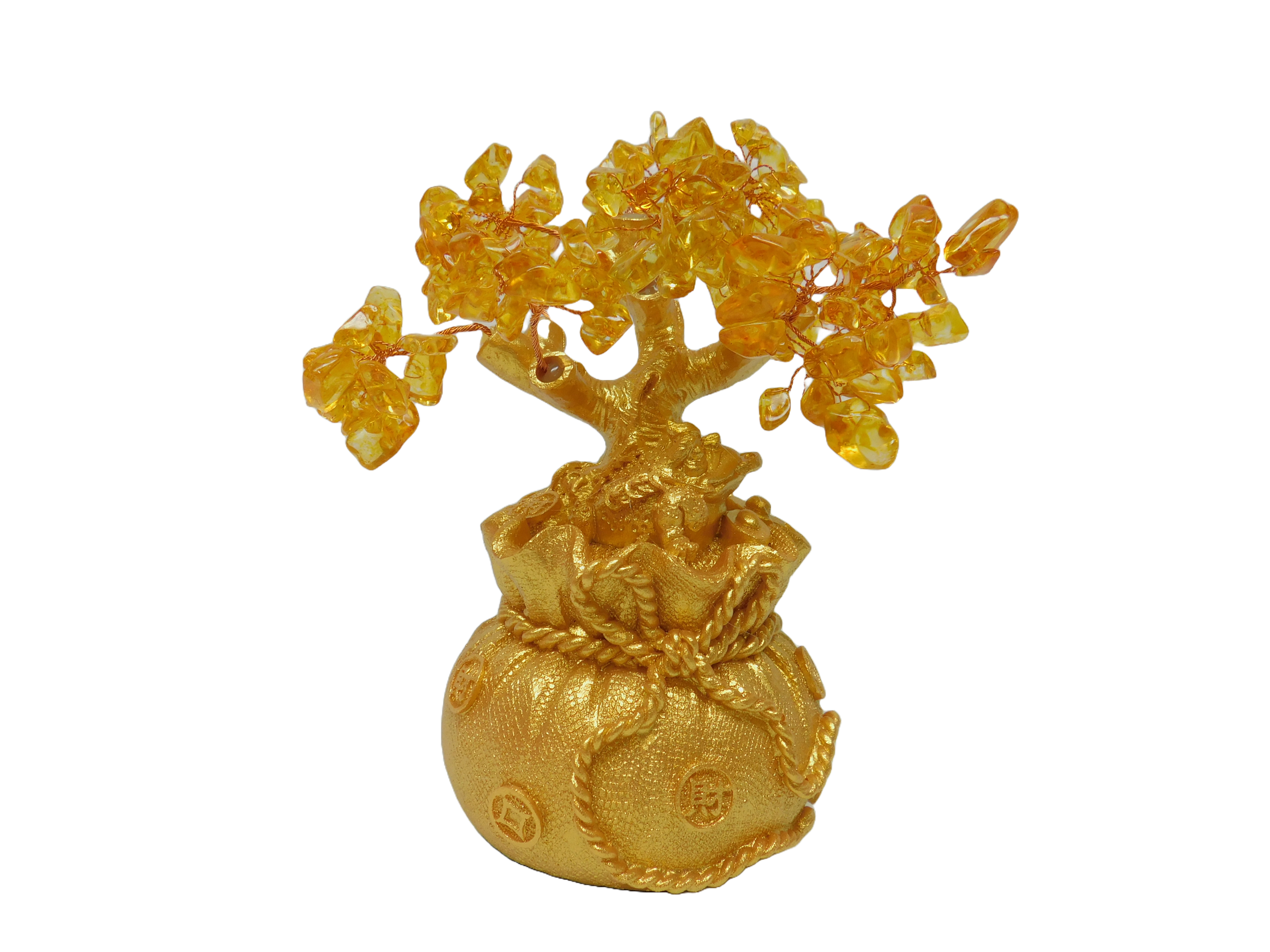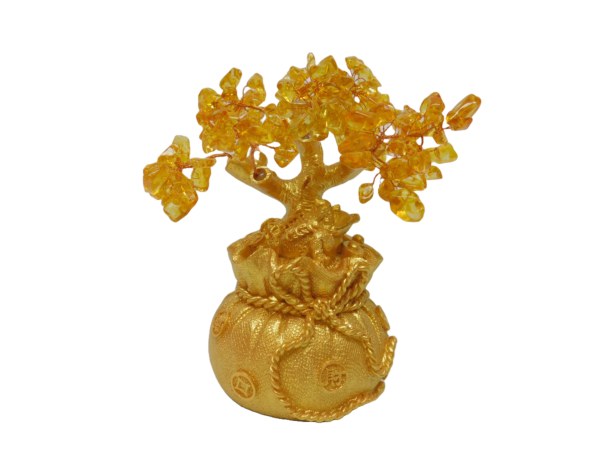 Description: 8″ x 5″ x 5″ GOLD CITRINE MONEY TREE W/ GOLD MONEY BAG BASE