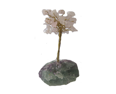APPROX. 3.5″ X 2.5″ X 2″ PINK QUARTZ GEM TREE W/FLUORITE BASE