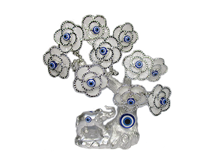 Description: SILVER EVIL EYE TREE W/ELEPHANT & WHITE FLOWERS