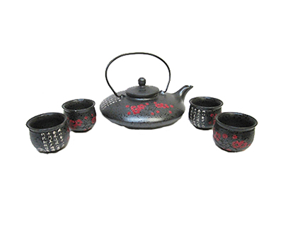 Description: 5PC DARK GREY TEA SET W/RED CHERRY BLOSSOMS