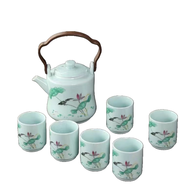 Description: TEAL TEA SET W/ LOTUS & 6 CUPS