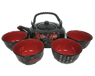 5PC BLACK W/RED CHERRY BLOSSOM TEASET