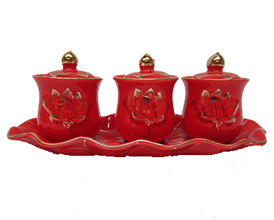 Description: 3PC RED WORSHIP CUP SET W/PLATE LOTUS DESIGN
